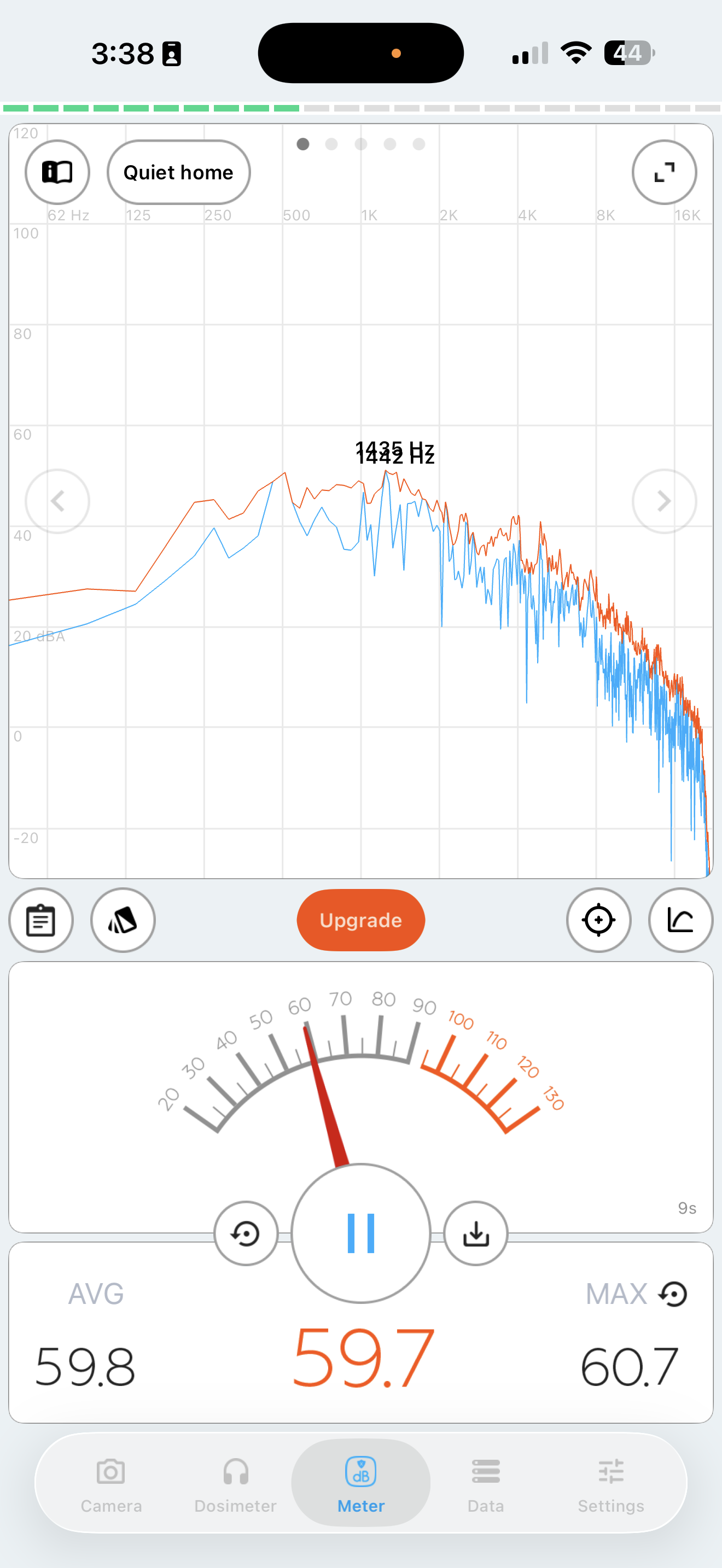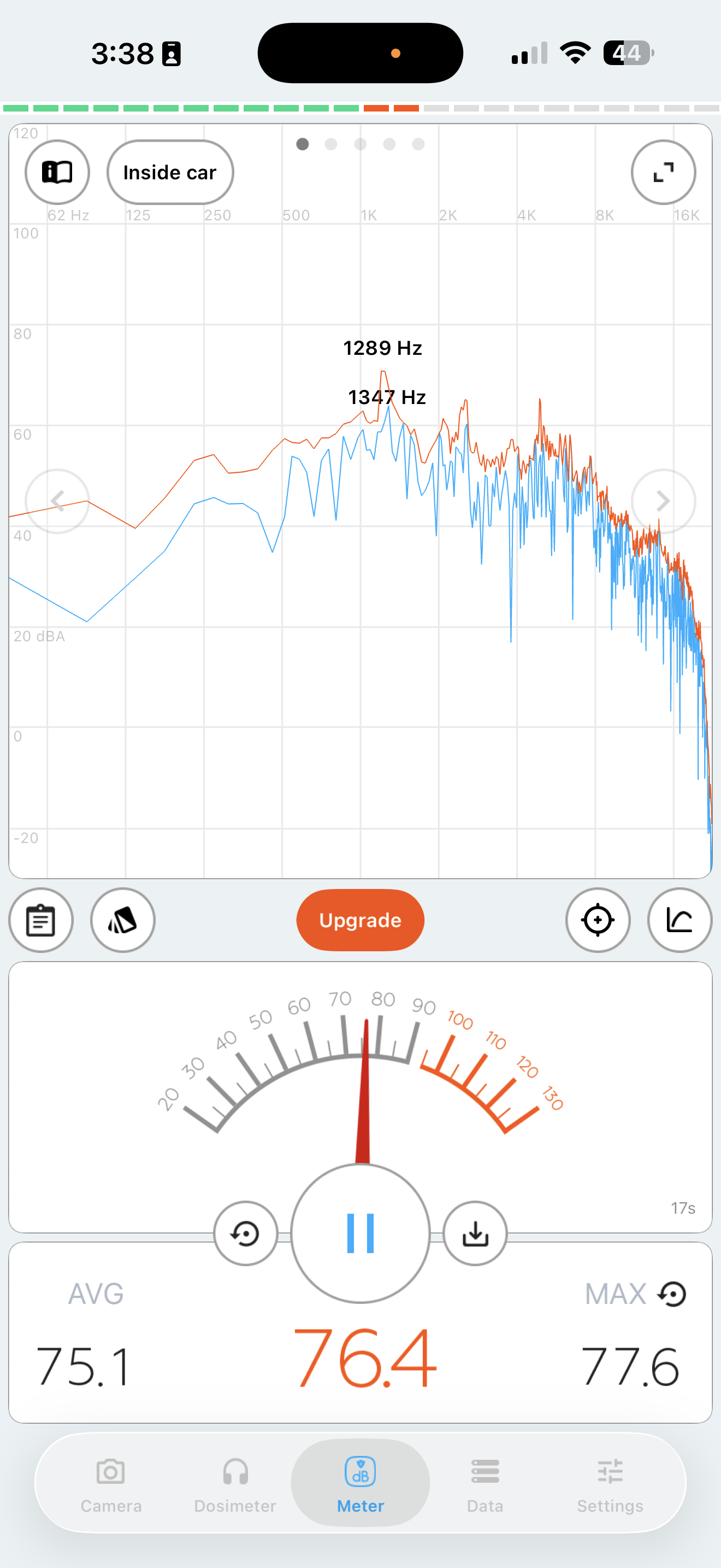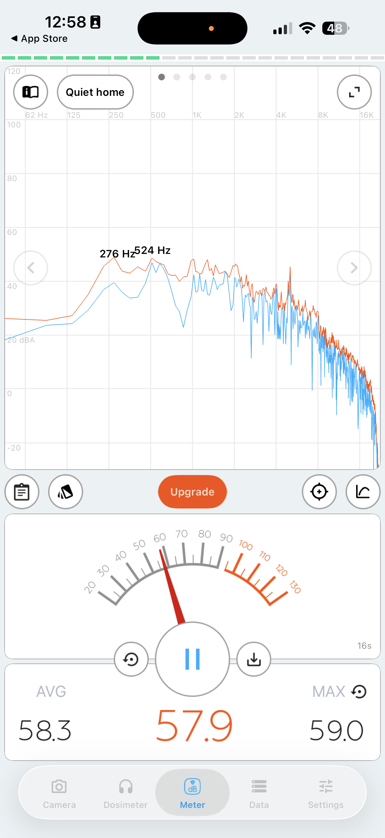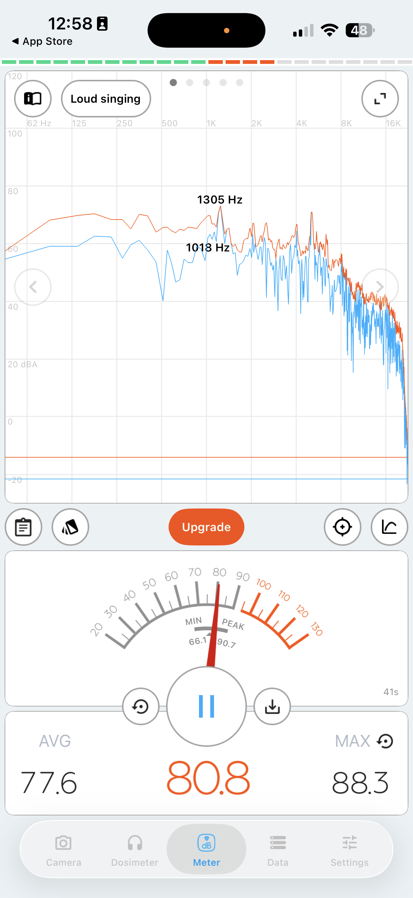 Initial sound measurements using Decibel X app. Left: right next to system (~77.6dB avg). Right: 2 meters away (~58.3dB avg).