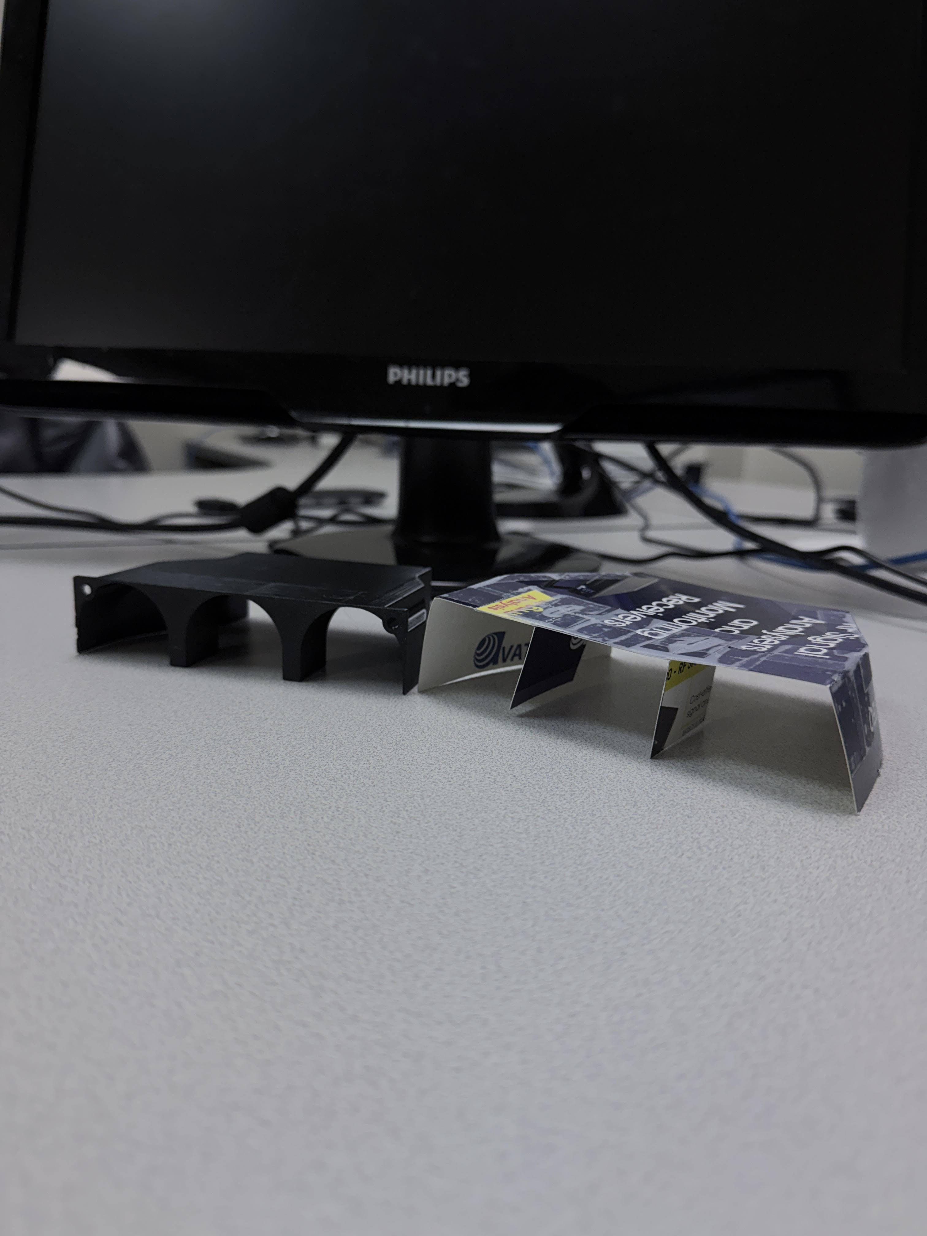 The cardboard prototype next to the final 3D printed version - quite the upgrade.