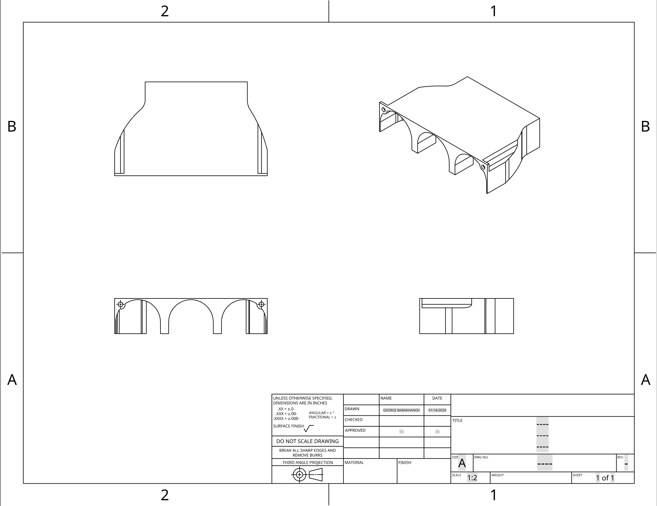 The final 3D model created in OnShape - multiple angles and the full technical drawing.